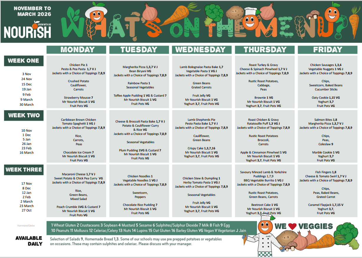 In the infant school all pupils are provided with a free hot school meal as part of the Government Universal Free School meal provision.   We work hard to ensure that the menu caters to the dietary needs and preferences of our learners.